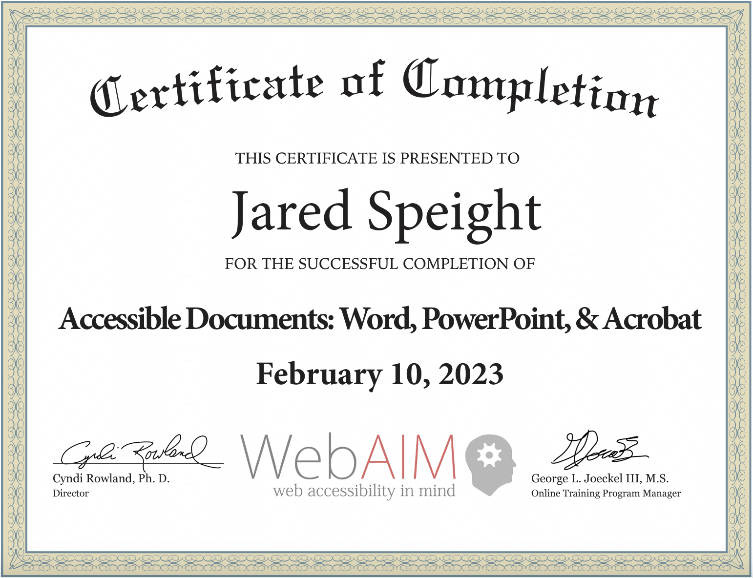 I finished up WebAIM‘s course on creating accessible documents using Microsoft Word, PowerPoint, and Acrobat, and I would highly recommend it to anyone responsible for creating learning documents to be shared with students, colleagues, or the public in general.